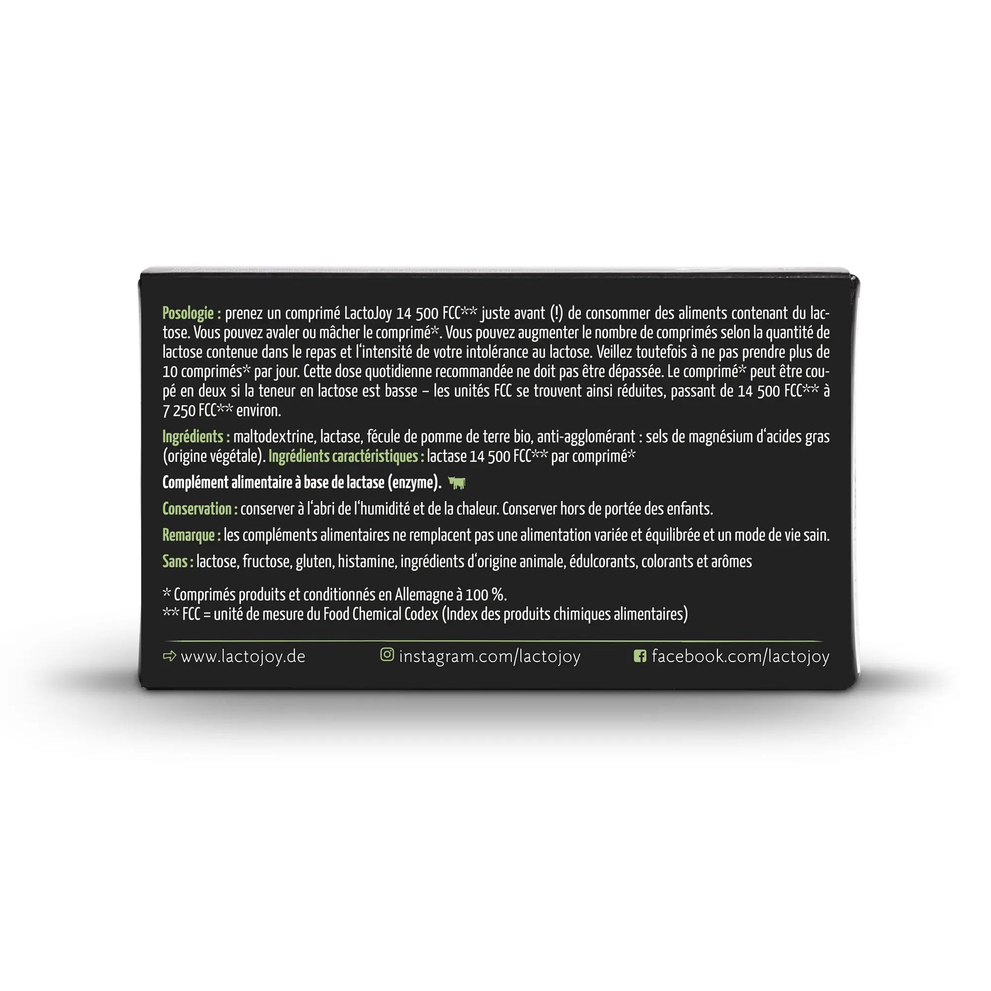 Oui, vous pouvez prendre une dose plus élevée de LactoJoy, qui contient 14 500 unités FCC, pour éviter de calculer la teneur en lactose de votre repas. Généralement, 6 000 à 10 000 unités FCC suffisent pour un verre de lait (0,2 l). Si vous avez besoin de moins, les comprimés LactoJoy peuvent être divisés en deux, fournissant 7 250 unités FCC.